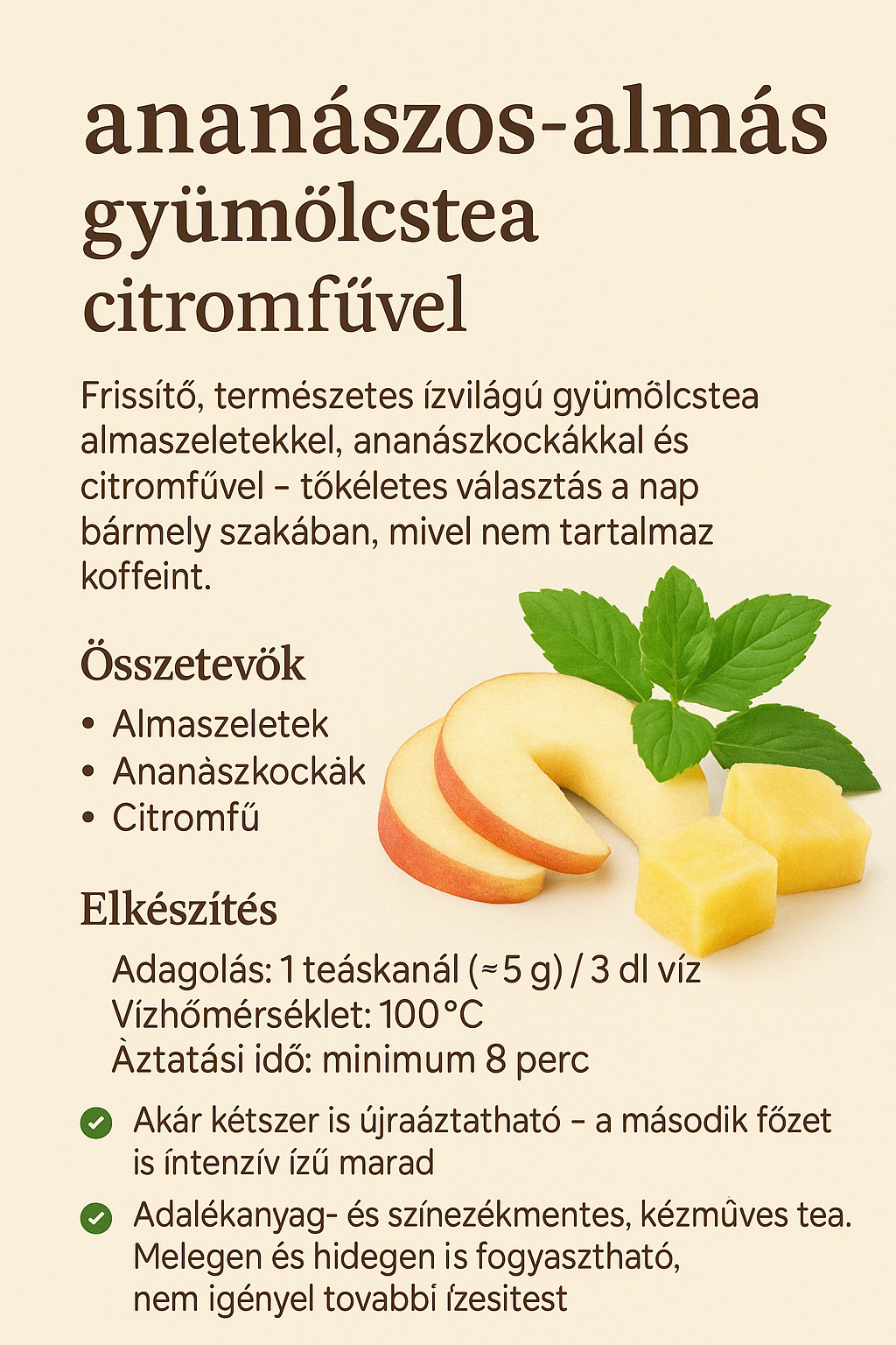 Összetevők: Almadarabok, ananászkocka (ananász, cukor), bodza, hibiszkuszvirág, rózsaszirom, rózsaszín rózsabimbó,fagyasztva szárított eperdarabok, rózsaszín rózsaszirom, fagyasztva szárított meggydarabok, fagyasztva szárított áfonyaszeletek.