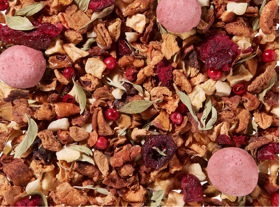 A tőzegáfonya, egy kis csipetnyi krémes tojáslikőr, gyümölcsös-cseresznyés ízekkel kombinálva valamint az áfonyaszeletek, fahéjrudak és csillagánizs ízesíti ezt a fantasztikus őszi-téli teát. Nagyon zamatos ízvilágba repíti a fogyasztót.