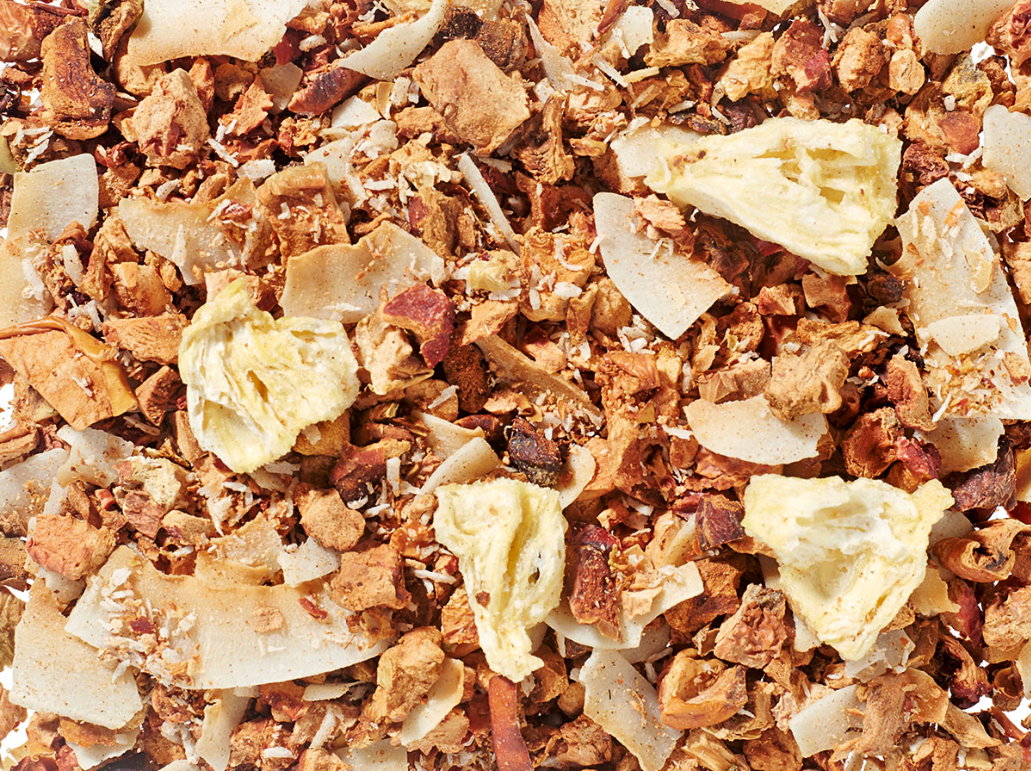 A ropogós kókuszchipsek, a finom kókuszreszelék és a liofilizált sárga ananászdarabok együtt teszik teljessé ezt a könnyed, nyári élményt. Melegen és jeges teaként is igazi kényeztetés – mintha egy trópusi koktél lenne a csészében.